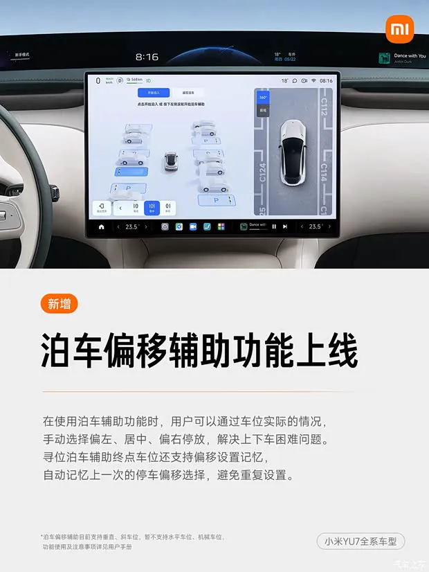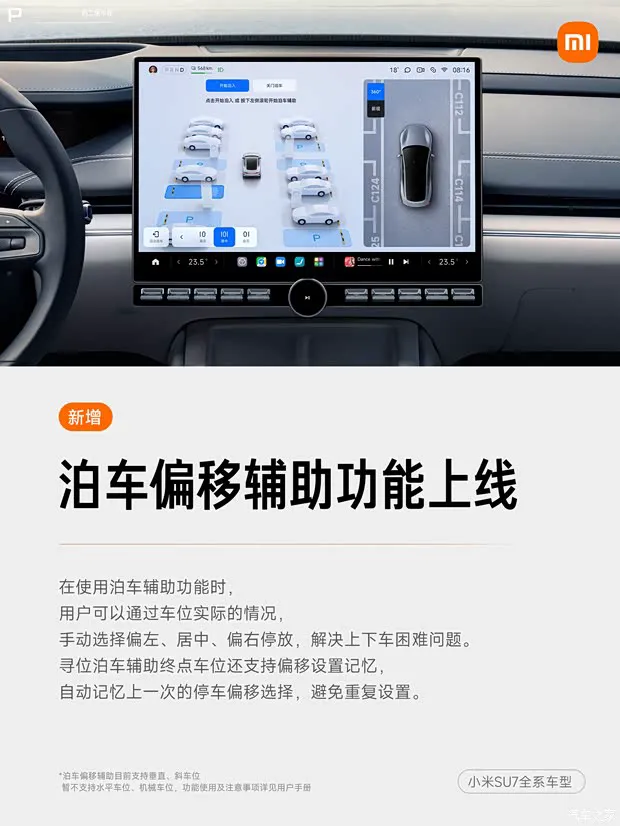 大家停车时可能都遇到过这种情况:车是停进去了,但因为旁边太窄,门打不开,人下不来。针对这个非常实际的麻烦,小米 YU7 新增了泊车偏移辅助功能。这个功能的聪明之处在于,它把选择权交给了用户。