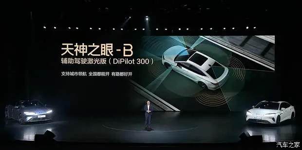 如果你选择的是顶配车型,那么你将体验到真正的高阶智能驾驶。这套系统被称为天神之眼 B-辅助驾驶激光版(DiPilot 300)。它的核心硬件优势在于引入了激光雷达,这不仅仅是配置单上的一个名词,而是意味着感知能力的质的飞跃。得益于更强的硬件支撑,顶配车型将支持城市领航辅助(CNOA)功能。这意味着在复杂的城市路况下,车辆也能实现点到点的智能导航辅助,彻底缓解城市通勤的疲劳感。