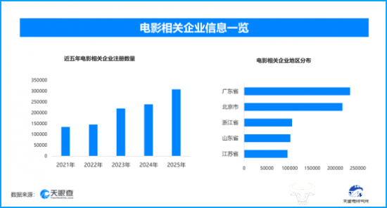 天眼查专业版数据显示,截至目前我国现存在业、存续状态的电影相关企业超172.6万家。其中,2026年截至目前新增注册相关企业约9.4万余家,从企业注册数量趋势来看,近五年间,电影相关企业的注册数量呈现出逐年增长的态势,并在2025年达到顶峰。
