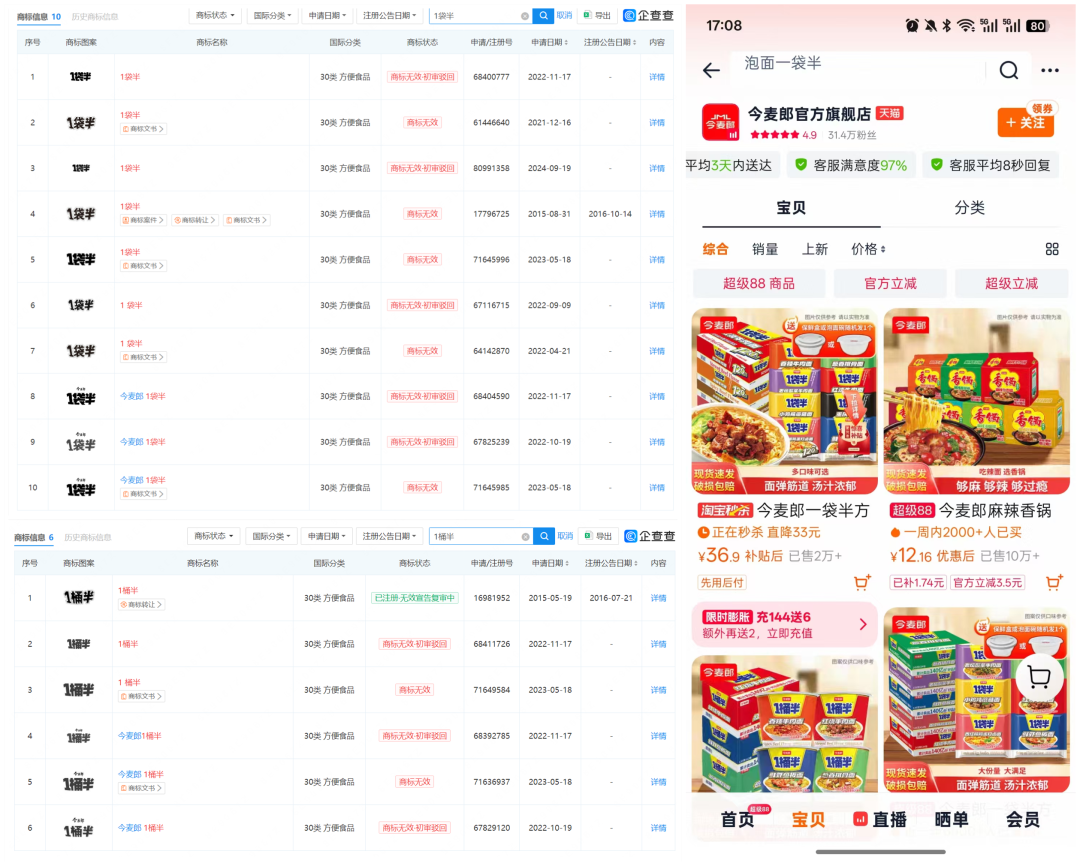 企查查显示,今麦郎曾申请“1桶半”“1袋半”“桶半”“袋半”“今麦郎1桶半”“今麦郎1袋半”“今麦郎1杯半”等易引发歧义的商标,不过除了2015年申请的“1桶半”、2024年申请的“今麦郎桶半”等个别商标已注册外,其他多被裁定无效或等待实质审查。